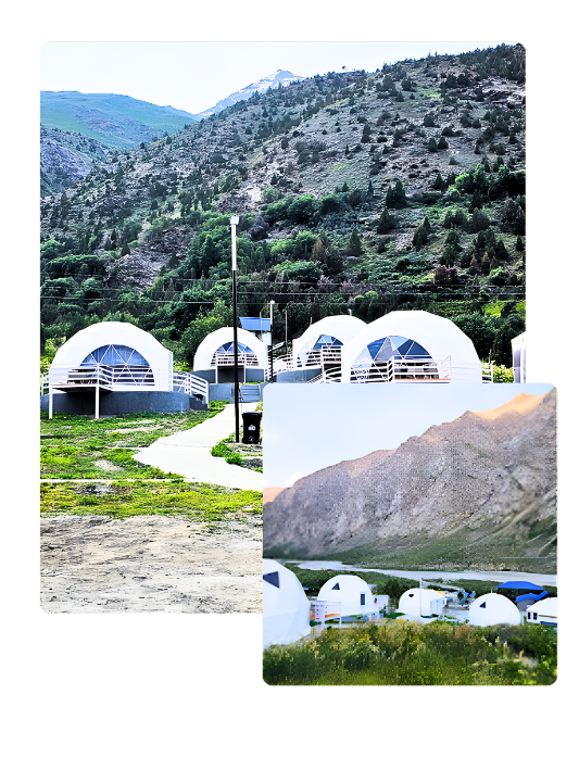 The resort offers cozy domes with modern amenities such as free Wi-Fi, heaters, and 24-hour hot water, ensuring a comfortable stay even in the coldest months. There is secure parking, an on-site restaurant serving delicious meals, and a free game zone for fun and relaxation. In winter, the area is covered with thick snow, and guests can try activities like snowboarding or join winter hikes. During other seasons, you can walk by the riverside, watch birds, and enjoy the beautiful valley views right from the property.